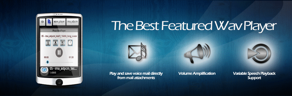 Picus WAV player is the simply the best featured WAV player on the market, to allow quick access to email attachments. Supporting a wide range of wav formats and other audio formats, Picus WAV player provides an easy to use interface to work on attachments. Picus WAV player can be used to open files directly from a file manager or an attachment. With digital amplification and Variable speed playback at constant pitch (VSP) as its unique feature, this light weight player allows you to hear your voice mails and Magic Jack WAV files clearly and easily. It also allows you the option to save a copy of the attachment.